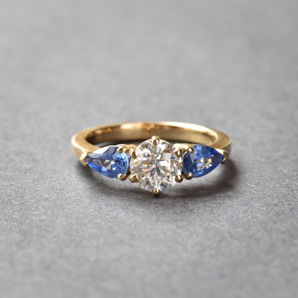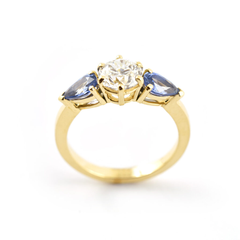 Pour effectuer une demande en mariage unique, notre client nous a demandé d’imaginer une bague de fiançailles sur-mesure associant diamant et saphir. Notre joaillier a dessiné cet élégant modèle basé sur un trio de pierres précieuses serties sur un anneau en or jaune. Le diamant central taille brillant est mis en valeur par un sertissage à six griffes et est encadré de chaque côté par deux saphirs taille poire, dont la couleur d’un bleu intense offre un contraste saisissant avec le métal précieux.