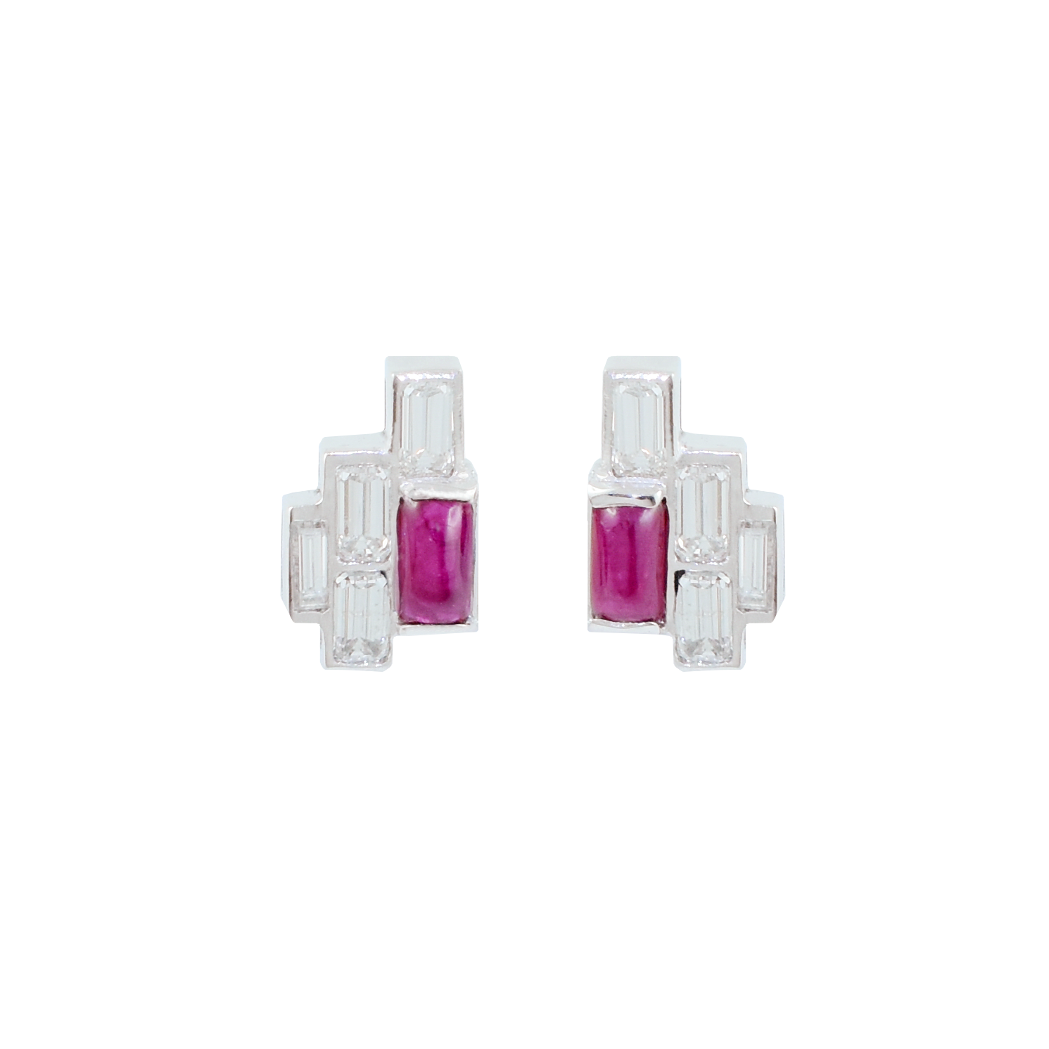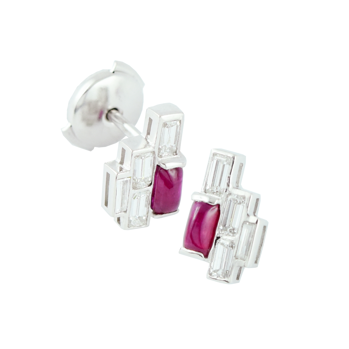 Inspirées par la rigueur géométrique du mouvement Art Déco, les boucles d’oreilles Pixel associent des diamants taille baguette et des rubis. Ce bijou très graphique joue sur un assemblage asymétrique de formes rectangulaires, créant un effet « pixelisé » audacieux et contemporain.