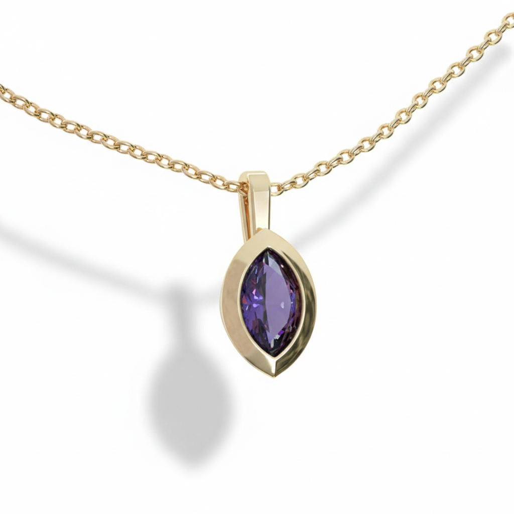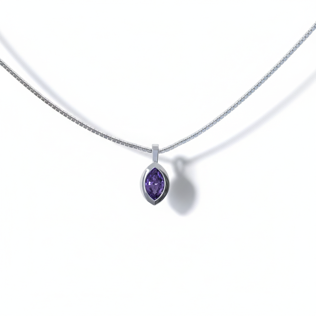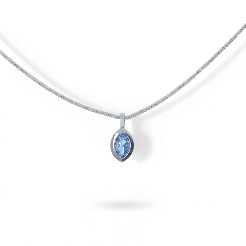 Clovettes est un pendentif serti griffes cornières pour un saphir facetté en navette (marquise).