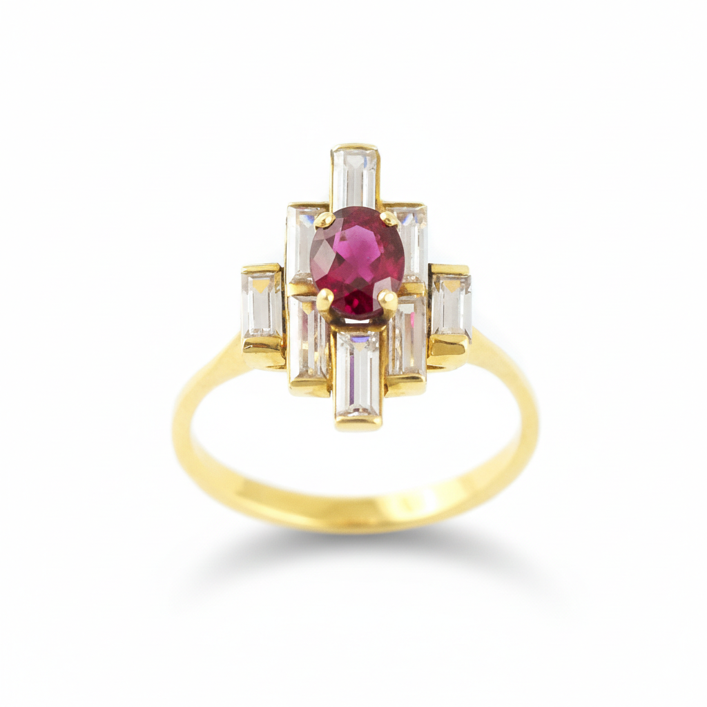 Le design de la bague Retro, résolument géométrique, déploie ses lignes en escalier comme un hommage assumé aux grandes heures de l’Art Déco. Un rubis ovale d’un rouge intense trône en majesté, encadré d’une architecture de diamants taille baguette disposées en jeu de niveaux qui captent et redistribuent la lumière sous tous les angles. Une bague intemporelle et singulière.