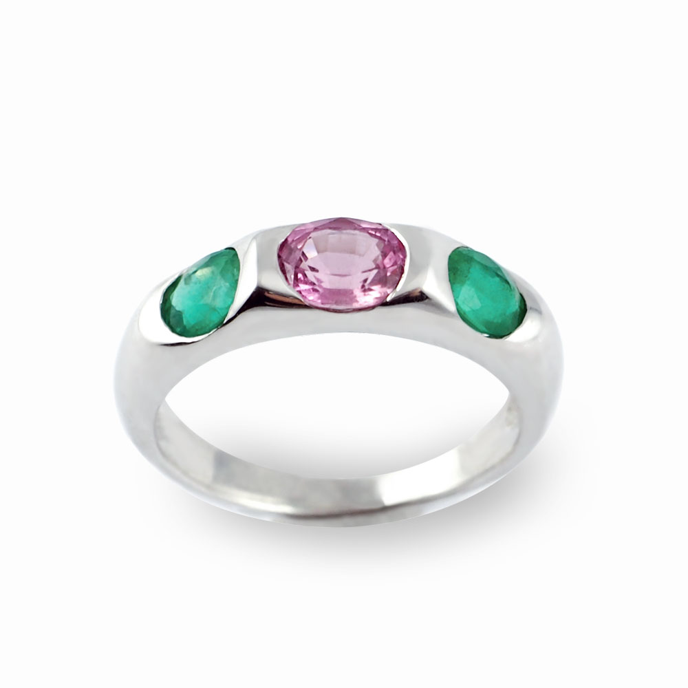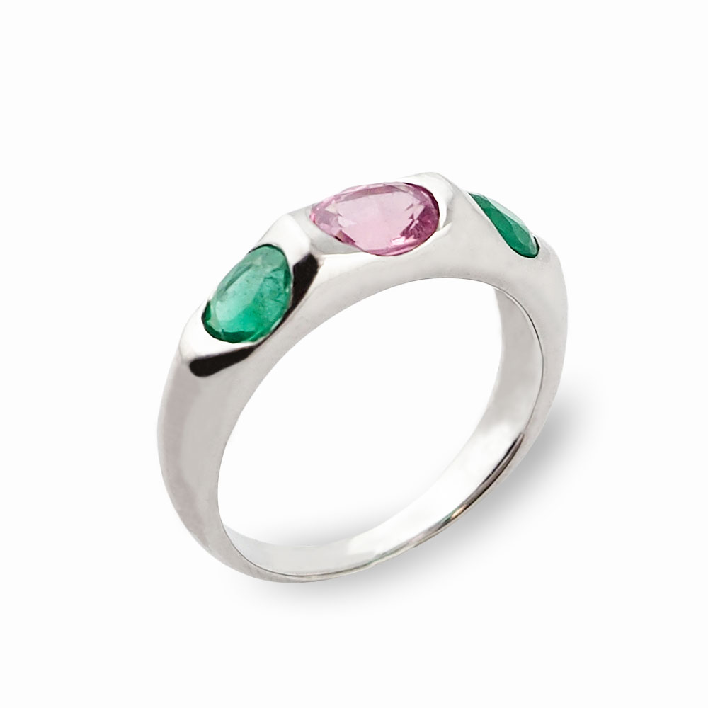 Diffraction est une bague jonc graphique et gourmande avec des pierres précieuses aux couleurs douces offrant un effet saisissant. Elle associe deux émeraudes ovales à un saphir rose rond en serti massé, un sertissage moderne et élégant. Une bague colorée et originale pour les adeptes de bijoux avec un design contemporain et épuré.