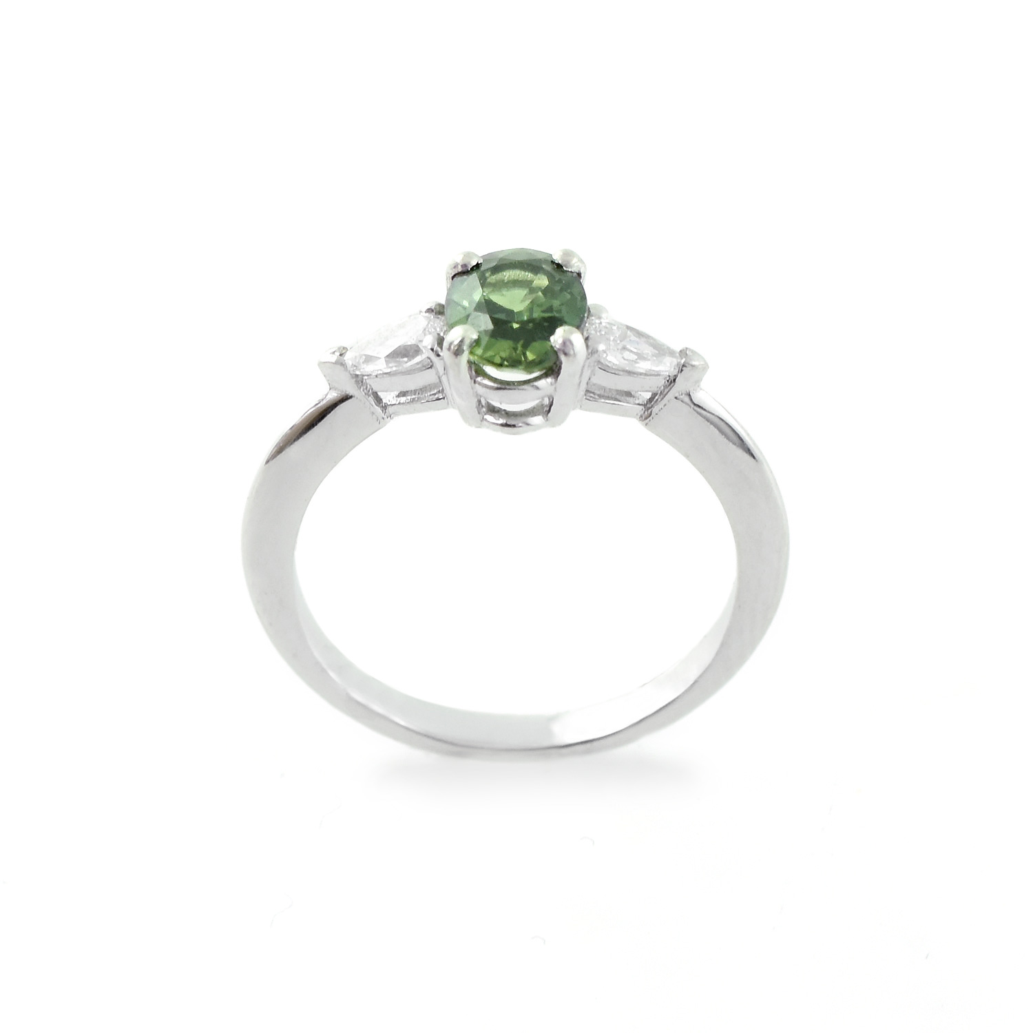 Bague en or 18 carats, saphir vert (7/5 mm 0.85 carat) et deux diamants (0.10 carat chacun)