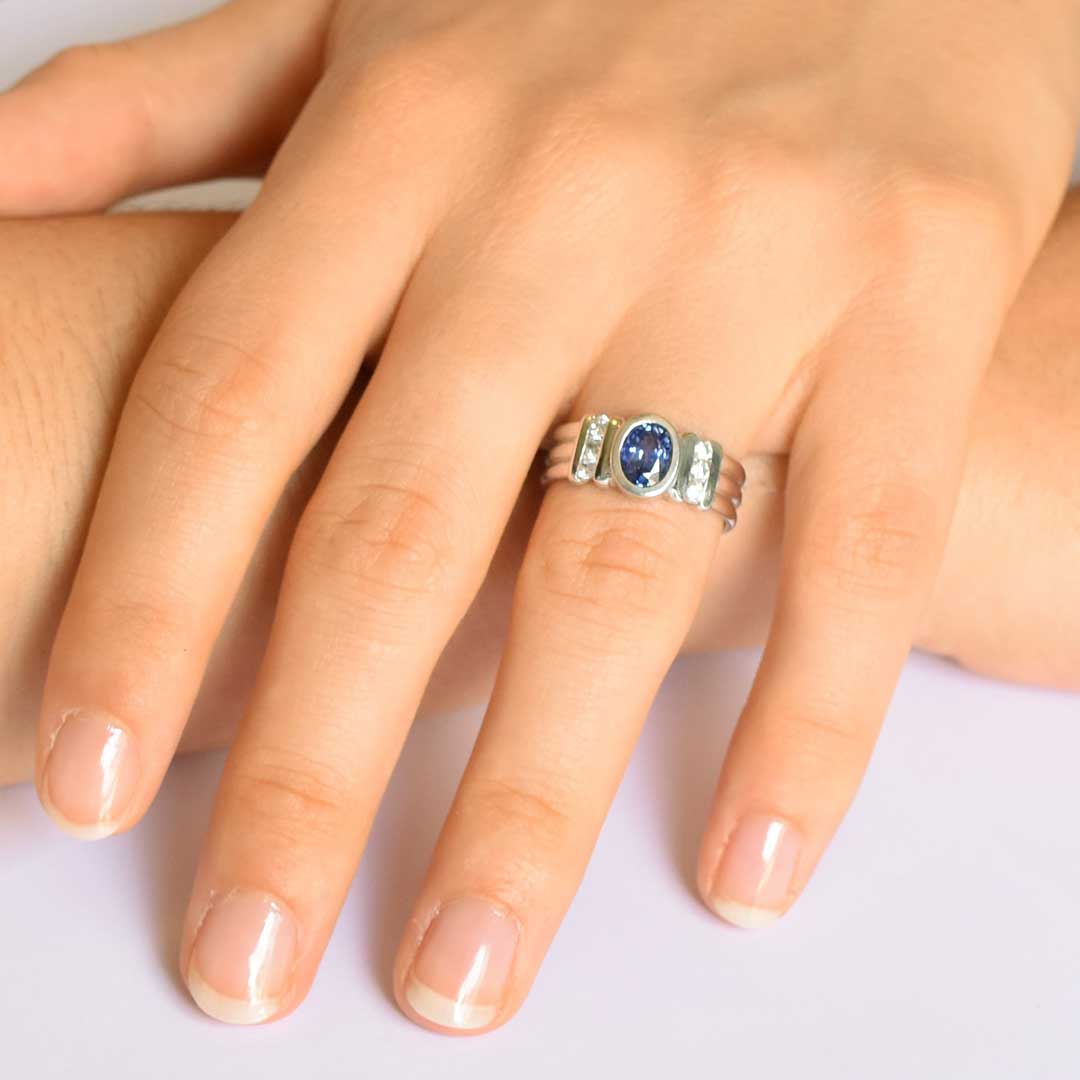 Bague en or 18 carats (750 millièmes) ou platine (alliage au choix), saphir et diamants.